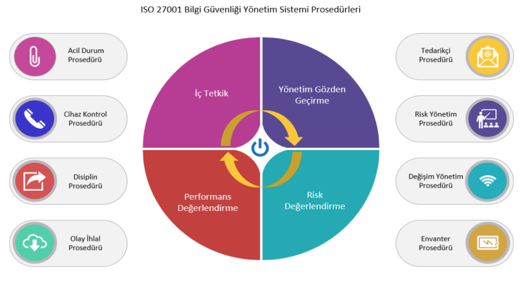 - ve diğer bilgilerini sınıflandırması, risk öncelik değerlerine göre sıralaması ve bu bilgilerin saklandığı ekipman ve cihazların (bilgi varlıkları envanter listeleri) listesini, son olarak belirlenen bu verilerin potansiyel risklere karşı bunların korunmalarını talep eden yönetim sistemidir. ISO 27001 bilgi güvenliği yönetim sistemi içerisinde diğer sistemlerde olduğu gibi prosedür, talimat, plan, görev tanımı, listeler ve formlar yer almaktadır. Amaç proseslerin yetkililerini sorumluluklarını ve işleyişlerini bilgi güvenliğini sağlayacak şekilde hazırlamaktır.